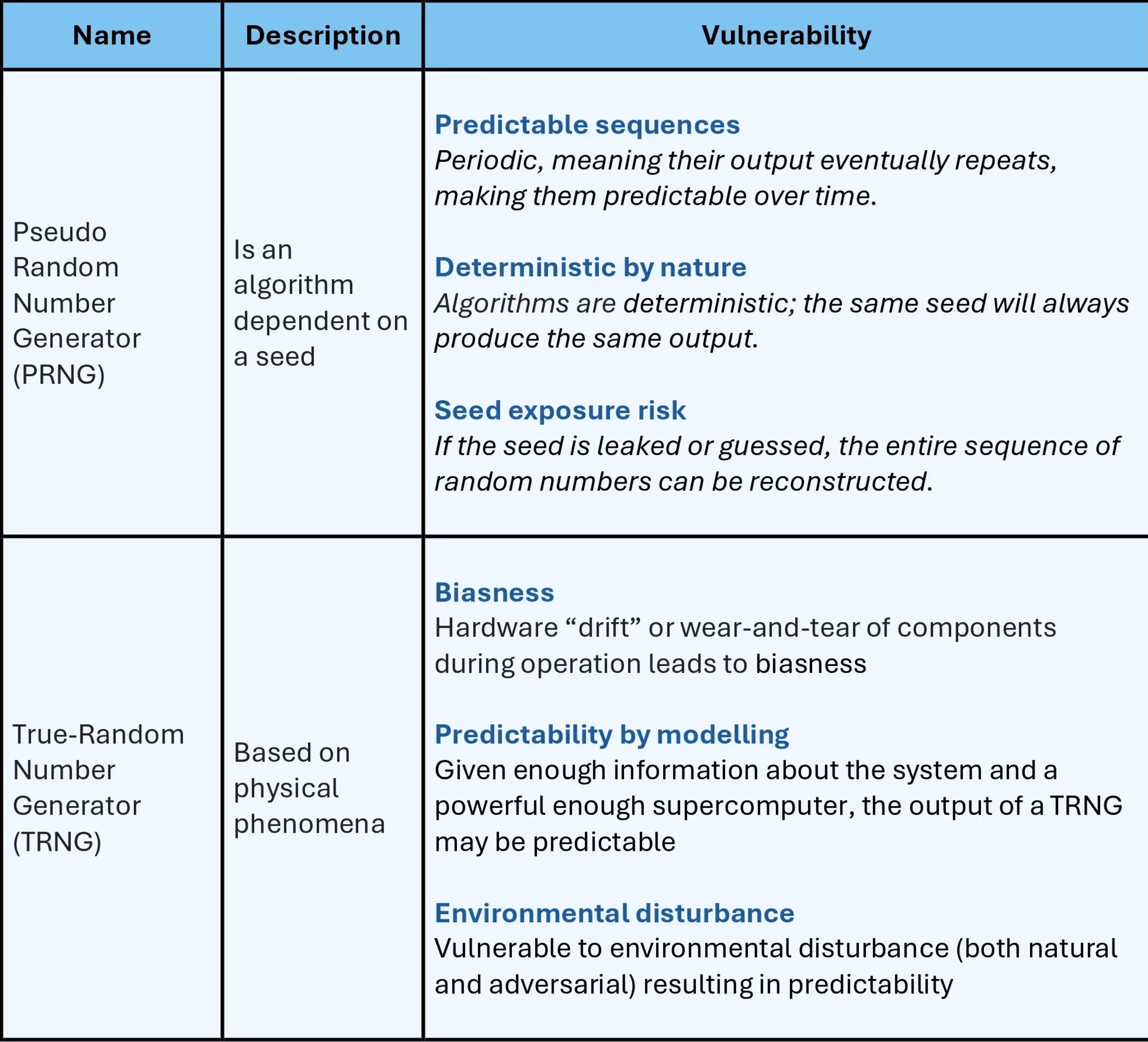By contrast, in addition to the vulnerabilities discussed in the table above, it is not possible to express the security of PRNGs and TRNGs in an information-theoretic manner.